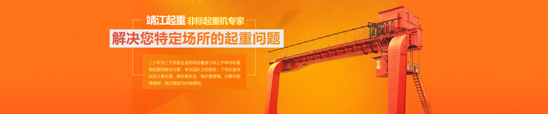 20余年專注起重機(jī)研發(fā)、制造、安裝和售后服務(wù),為你量身定制,解決特定場(chǎng)所物料搬運(yùn)問(wèn)題。